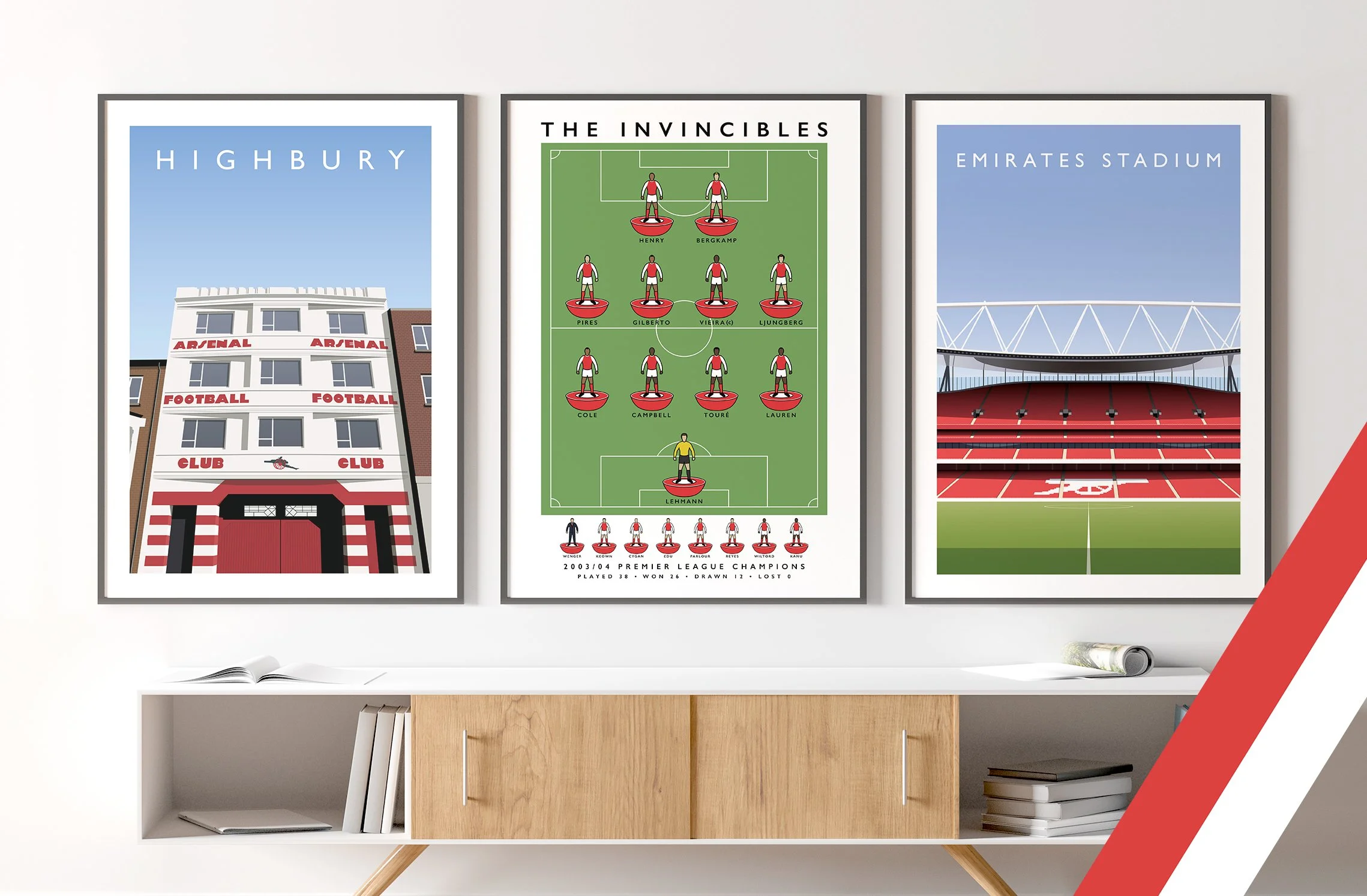 Matthew has a wide range of Arsenal prints, taking in the the ‘89 title win, the Invincibles team as well as designs of Highbury & The Emirates. The prints are available in A4, A3, A2 & A1 with optional framing