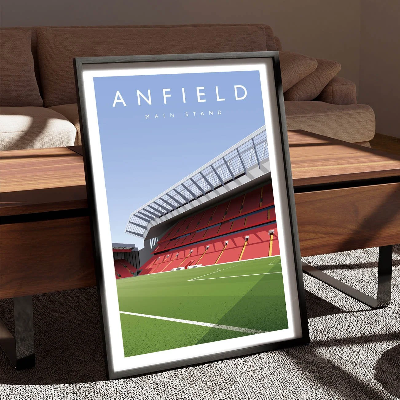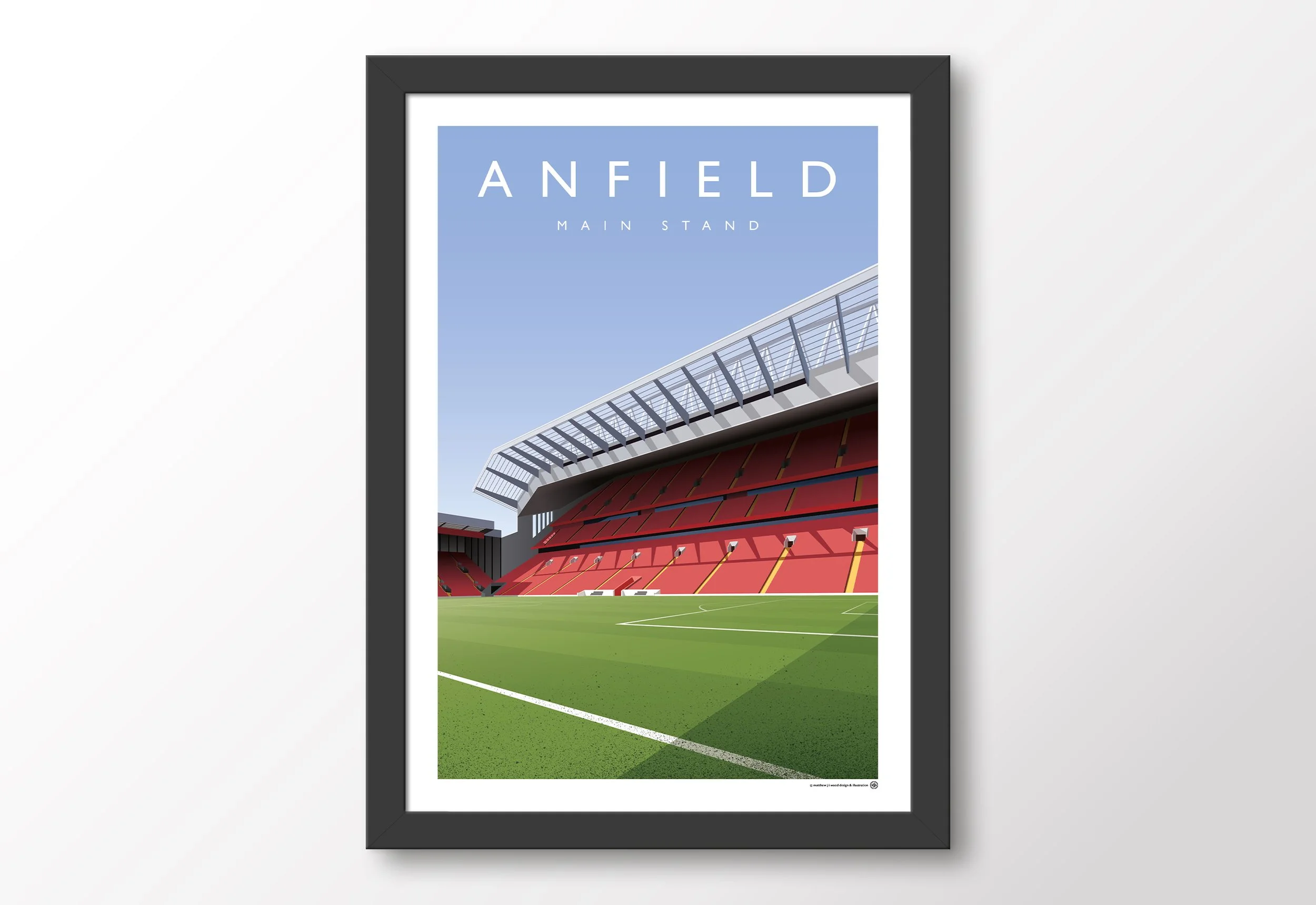 Poster showing multiple views of Anfield, the home of Liverpool Football Club, including the Sir Kenny Dalglish Stand, The Kop and the Main Stand