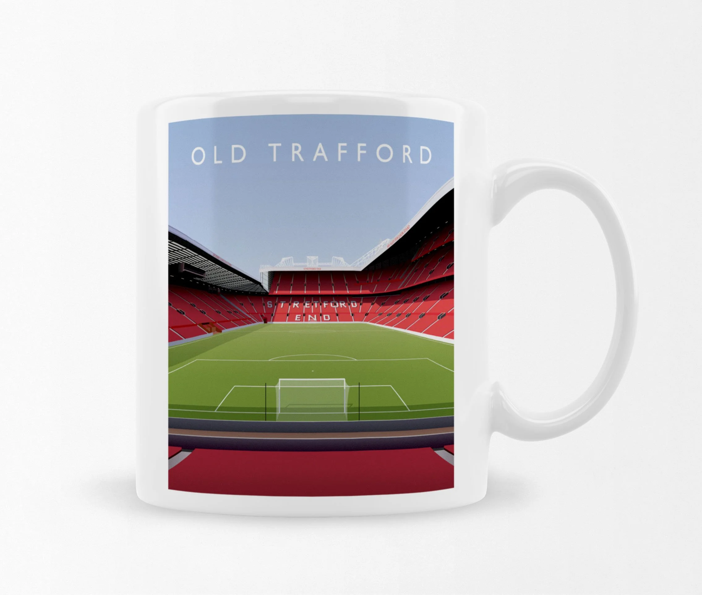 Poster of Old Trafford, the home of Manchester United Football Club, showing the Sir Bobby Charlton Stand, The Stretford End and The Sir Alex Ferguson Stand